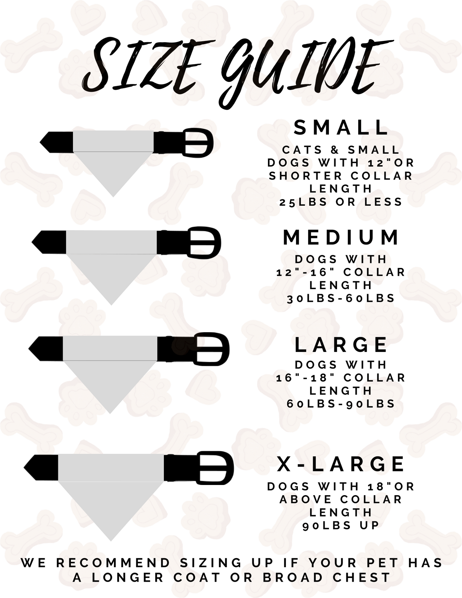 ~ We recommend sizing up OR measuring loosely if your pet has a longer coat of hair/fur (shih tzu, collies, shepherds) so that the bandana will be more visible